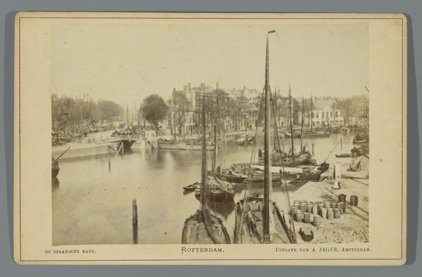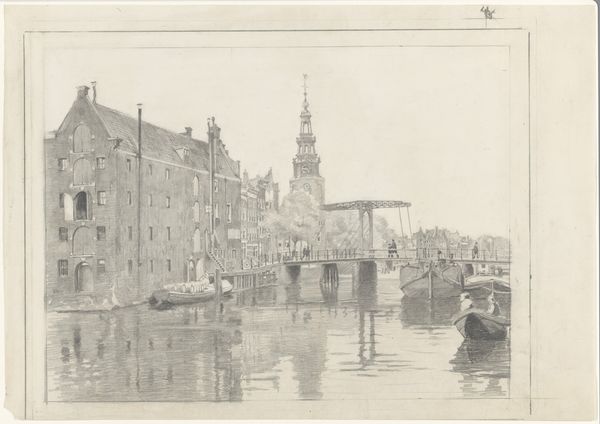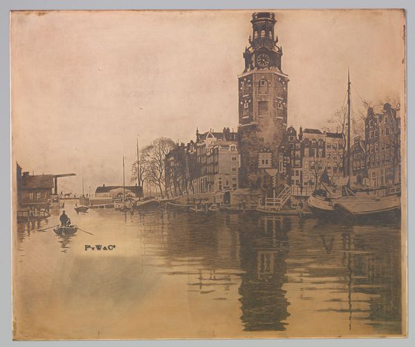 Curator: Willem Witsen's etching, "Gezicht op de Montelbaanstoren in Amsterdam," created around 1913-1914, offers a glimpse into the city's waterside life. Editor: It feels incredibly serene. The soft greys and browns, combined with the water reflections, create this peaceful stillness despite being a cityscape. Curator: Witsen was part of a group called the Amsterdam Impressionists. They focused on capturing everyday life and the atmosphere of the city, and his interest lay in how social and cultural perceptions shaped Dutch identity. The tower itself represents resilience, a historical marker witnessing centuries of transformation. Editor: Absolutely. The Montelbaanstoren is a powerful symbol. Historically, towers are so evocative – markers of time, boundaries, warnings. The etching reminds me of Piranesi’s architectural fantasies, only grounded in a tangible reality. Curator: Considering Amsterdam’s legacy as a global trading hub, the water in the image acts as a crucial artery—it is so vital to how the city’s economy functioned but it also mirrors society at a human level, reflecting their culture and life onto its surfaces. This location near the harbor can be interpreted as a space of encounters. Editor: I’m particularly drawn to the way Witsen uses light and shadow on the water. The reflection of the tower feels almost as solid as the structure itself. In contrast, the lone figure in the rowboat adds a layer of human scale. Curator: His placement highlights a certain urban experience in the age when modern advancements intersect with the older world; consider the position of the rower, for example. The reflection of the building casts a large shadow onto the man in the boat, perhaps a metaphor for how established societal standards loom over individual autonomy? Editor: That's an intriguing consideration. To me, that small boat signifies a lone observer drifting along; this image and its calm aesthetic can mean many things depending on who is experiencing the space. Curator: Well, regardless, what Witsen captured is more than just a picture—it’s a preserved memory imbued with intricate connections between identity and cultural memory. Editor: It is a wonderfully quiet meditation on the meeting of history, memory, and perception.