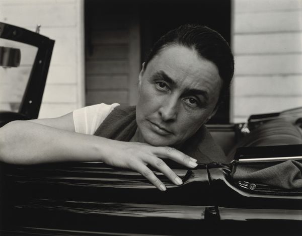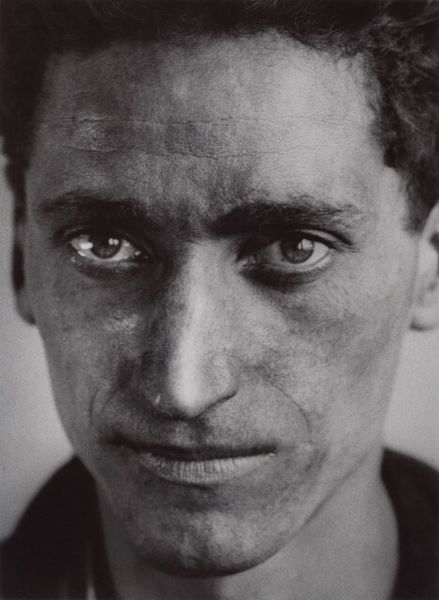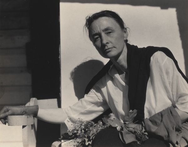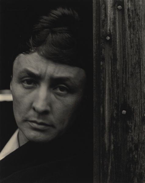 Curator: This is a striking black and white photograph titled "South Lebanon, 1952," part of Akram Zaatari's work with the archive of Hashem el Madani. Editor: Immediately, the texture jumps out—the rough wooden planks contrast with the man's crisp shirt, creating a compelling visual tension. Curator: Absolutely. The backdrop speaks to the vernacular architecture, becoming a symbolic "wall" bearing witness to a specific time and place. Those faint scribbles, perhaps local graffiti, add layers. Editor: I'm drawn to the subject's gaze, direct and unflinching. He seems to embody a certain resilience. Curator: That's the power of Madani's portraits. They capture the human spirit amidst everyday realities, documenting a local culture. Editor: Indeed, and Zaatari's curatorial choice amplifies this, turning personal history into a collective memory. Curator: Considering the image's historical and cultural dimensions has offered me new perspectives on the photograph's cultural weight. Editor: And for me, the interplay of textures and the direct gaze have revealed new depths in its form.