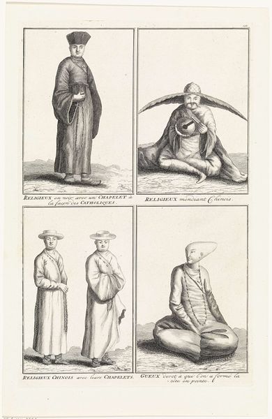 Curator: Good day. We are here to discuss a rather curious piece titled "Three Landscapes with Men and Women in Dutch Costumes," created around 1775 by Cornelis Brouwer. It's currently held here at the Rijksmuseum. Editor: My first thought? It's like peering into a history book through a fashion blogger's lens. Each vignette seems frozen in a very formal sort of parade. Curator: Precisely! Brouwer employs a tripartite structure, segregating different landscapes, each populated by figures adorned in what would have been considered characteristic Dutch garb. Observe the details: the etching and engraving lend a certain precision, a documentary quality if you will, while still allowing room to portray elements of genre. Editor: It feels very deliberately arranged, doesn’t it? It’s not just a document of clothing; it’s telling us something about the social spaces these clothes belong to. Almost like a carefully constructed stage set. Are they archetypes or portraits, I wonder? They almost feel like characters in a play. Curator: The figures certainly border on the archetypal. While the technique doesn't allow for precise facial renderings, the costume – each ruffle, hat, and drape is meticulously detailed. The intention appears less portraiture and more about representing distinct Dutch identities tied to these locales. We can deduce something from what each segment chooses to present. Editor: Yes, look at the placement within the landscapes themselves, they become backdrops! Is the rigid presentation ironic somehow? Or sincerely ethnographic in intent? I like thinking about this and if it’s both. Curator: The intersection of both is what provides its appeal. Though the rigidness may give pause to those unfamiliar with period illustration and print work. This piece provides us insight into how the Dutch chose to present themselves— or wished to be seen. Editor: For me, looking at each little scene is akin to flipping through a deck of antique postcards. Little time capsules that tease much more than they reveal about past lives. Curator: Agreed. Through the lines etched meticulously, the intention transcends mere recording. It creates something layered; an artifact infused with social ambition and a very precise, tailored view of self.