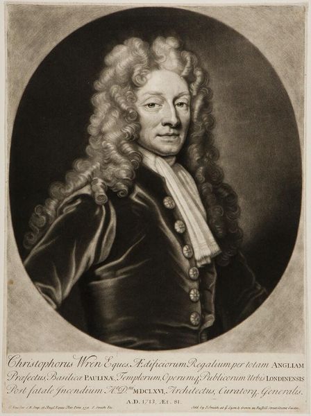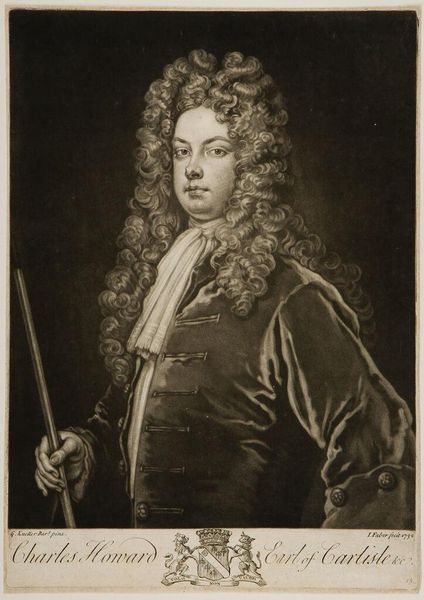 Editor: This is Jan Faber the Younger's portrait of William Congreve. The dramatic lighting and pose suggest a figure of great importance. What symbols or messages do you see conveyed here? Curator: The flamboyant wig, a clear status symbol, speaks volumes. The subject's pointed finger, a rhetorical gesture, suggests authority. Consider, also, the implied landscape behind him – a stage, perhaps? Does it evoke the pastoral ideal or something more performative? Editor: That's interesting! The landscape does seem like a backdrop. Thanks for pointing out those clues! Curator: Indeed. Such symbols help us understand how Congreve wished to be remembered. Visual language shaped perception in his era, just as it does today.