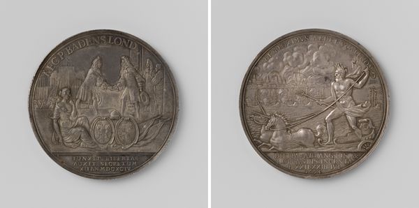 This silver medal was made by Martin Holtzhey in 1747, at a time of great political tension. Minting coins and medals was a highly skilled activity, involving not only metallurgy but also the art of die-making. This medal commemorates the breaking of the Barrier Treaty by the French. The very materiality of the silver speaks to the complex relationships between politics, labor, and consumption. On one side, we see a female figure, symbolizing the United Netherlands, standing defiantly as a lion rests beside her, sword in paw. On the other side, a figure kneels before an altar, praying for deliverance. The inscriptions underscore the medal's purpose: to mark the beginning of 1747 and to express hope for peace amidst conflict. The act of minting such a medal involved considerable labor, from the mining of the silver to the intricate engraving of the dies. This medal shows us how artistry and craft were intertwined with the political and social issues of the time.