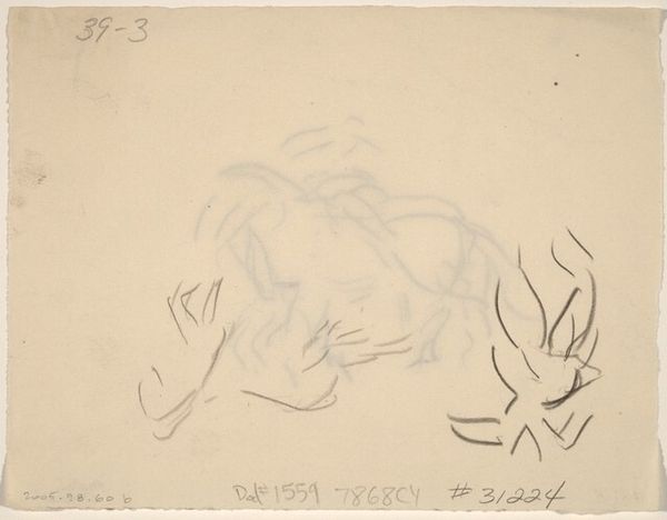 Editor: Here we have Jean-Louis Forain’s “Sheet of Sketches, recto and verso”, created with pencil on paper. The sketch feels quite intimate and fleeting, almost as if we are glimpsing a private moment. What strikes you about it? Curator: Indeed. What resonates with me are the unfinished qualities and how these lines, though minimal, evoke such tangible emotion. The rapid, almost frantic, strokes forming the upper figure's hair contrast sharply with the more deliberate contours below. What kind of symbols do we find embedded in fragmented representations of the body? Editor: I'm not sure. I see tenderness in the grouping, perhaps. Curator: Perhaps the sketches tell a deeper narrative than what’s visible at first glance. Throughout history, representations of shared physical space symbolize power dynamics, familial bonds, and cultural memory. How might these figures challenge conventional artistic or societal expectations? Editor: It's interesting you say that. They do seem unconventional... less posed, more realistic? Curator: Precisely. The deliberate lack of refinement transforms this drawing into an expression of authentic feeling, capturing not only external features, but also internal states. Editor: That makes me see the intimacy even more! I appreciate that it is like a moment captured in time. I had not initially viewed it as powerful as an artwork until it was deconstructed and its emotion highlighted. Thank you for sharing. Curator: And thank you for providing an inquisitive approach. There is a continuous discovery embedded within any image!