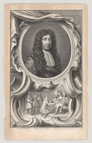 Editor: This is an engraving of George Savile, Marquis of Halifax, by Jacobus Houbraken. It seems to be a formal portrait, but I am curious about the little scene below him. What's your take on this piece? Curator: The framing of Savile with that scene emphasizes the constructed nature of power and reputation in the period. These prints circulated widely, shaping public perception. The theatrical backdrop suggests how performance and image management were crucial aspects of elite identity. Editor: So, it’s less about capturing an individual likeness and more about projecting a specific persona for public consumption? Curator: Exactly. The print serves as a form of propaganda, reinforcing Savile's status and influence within the socio-political landscape. Editor: That's a perspective I hadn't considered. Thanks! Curator: Indeed, art often reflects and shapes the political narratives of its time.
