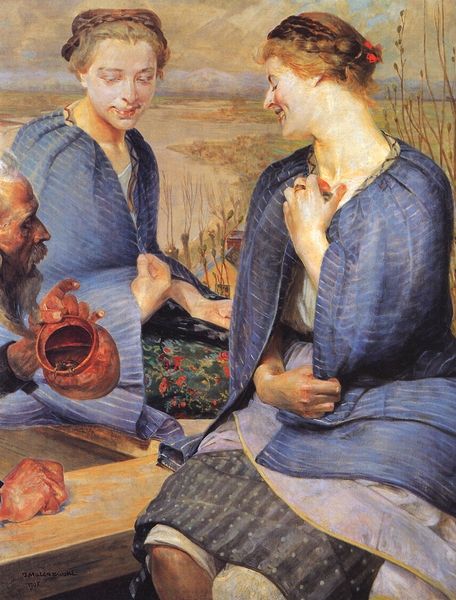 Editor: Right now, we're looking at "Poisoned Well IV," an oil painting by Jacek Malczewski. I'm struck by the two figures: a woman looking almost serenely off to the side and an older man peering intensely into what I assume is the poisoned well itself. There's a tension, almost a foreboding. What do you make of it? Curator: Ah, yes, "Poisoned Well IV." It whispers of a forgotten fairy tale, doesn’t it? The colours hum with unease, a sort of pre-storm stillness. Notice how the old man's gaze is fixated, desperate even, while the young woman seems detached, lost in a world of her own. I can't help but imagine she’s dreaming of escape while something insidious festers nearby. Do you see that dichotomy in the landscape, too? Editor: Now that you point it out, definitely. There's a stark contrast between the muted background and the more vivid foreground with the two figures. Curator: Exactly! Malczewski, he was obsessed with the symbolism of good and evil, life and death – wrestling those concepts in his work, trying to expose hidden truths. The poisoned well, the beauty, the dread… it’s a delicious recipe for the subconscious, isn’t it? What's the well poisoning, do you think? Ideas? Dreams? Hope itself? Editor: It's definitely a painting that makes you ask questions. I appreciate how it doesn't offer easy answers. Curator: I think so too. I wander off with a sense of unease mixed with a thrilling touch of hope. The world, even a poisoned one, continues to unfold in a way all its own. Editor: I'll definitely be spending more time looking at Malczewski’s other work. Thanks for sharing your insights!