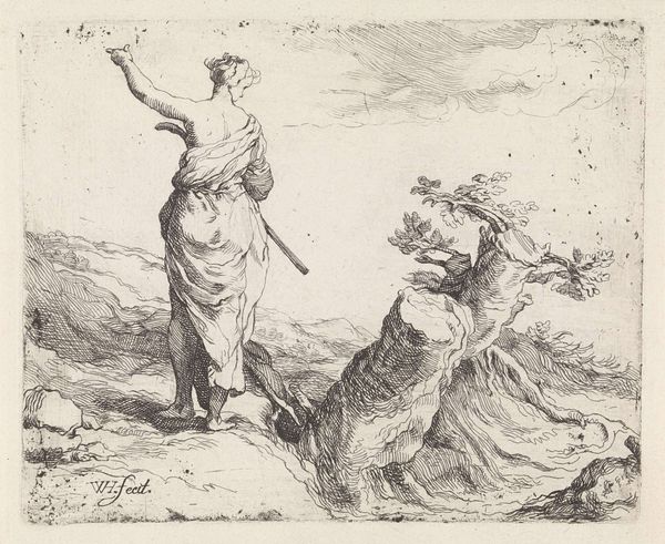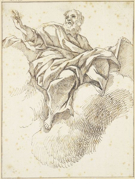 Editor: So, here we have "Seated Warrior with Halberd," an ink drawing by Alexander Ver Huell, made sometime between 1832 and 1897. It looks like a pen sketch. The warrior has such a dejected, almost defeated posture. What do you see in this piece? Curator: I see a powerful critique of militarism and its effects on the individual. While seemingly a historical study, consider the timing. Ver Huell, living through periods of immense social change and colonial expansion, might be using this warrior figure to comment on the burdens and disillusionment of soldiers in his own time. What does it mean to depict a warrior in repose, burdened rather than triumphant? Editor: That's interesting! I was so focused on the visual elements, like the hatching and the way he used ink to create depth. I hadn’t considered that this could be a broader commentary. Curator: The medium itself—ink, a tool of documentation and bureaucracy—adds another layer. Is this drawing a celebration of military prowess or a somber reflection on the individual caught within larger power structures? Look at the figure’s posture: slumped, almost melancholic. Where is the glory? Editor: Now I see the tension. The detailed rendering suggests respect for the warrior's craft, but the overall mood implies a condemnation of violence or, at least, its psychological toll. Curator: Exactly! And it encourages us to consider the ongoing struggles of those who serve, often rendered invisible by romantic narratives of war. How do we reconcile historical depictions of soldiers with contemporary understandings of trauma and its lasting impacts? Editor: It makes you rethink the narratives we inherit. Thanks for pointing out those connections! Curator: Absolutely. It's through these dialogues, questioning and re-evaluating, that art truly becomes a mirror reflecting our society and challenging our perspectives.