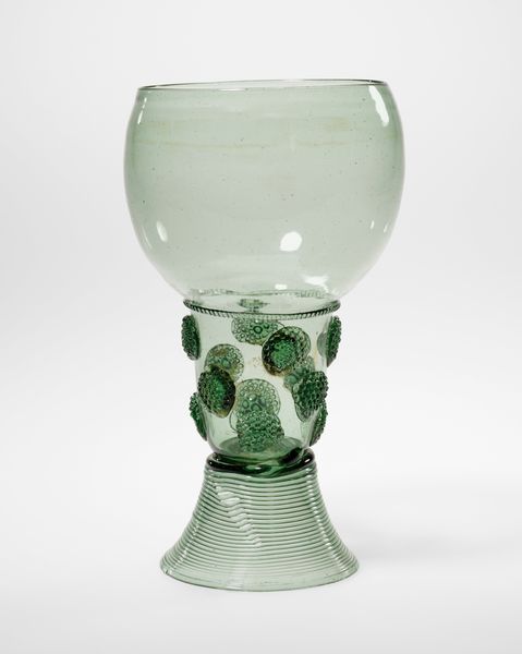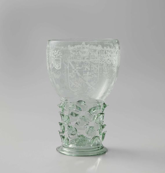 This delicate Roemer glass, of unknown origin, is adorned with the inscription "A Demain Les Affaires"—'To Tomorrow, Business.' Here we see a vessel meant for convivial gatherings, where the cares of the day are momentarily set aside, under the influence of wine. The inscription is a symbolic deferral, a ritualistic promise to postpone worldly concerns, much like the ancient Roman festivals of Saturnalia, where social norms were inverted. The clustered prunts on the stem, like swollen grapes, evoke Bacchic revelry and stand as reminders of the intoxicating pleasure that has moved through art history, from classical Dionysian frescoes to Renaissance bacchanals. Note how the inscription, etched with fleeting elegance, echoes the sentiment of carpe diem. This is not a new concept; it resurfaces in the memento mori tradition, reminding us of the transience of life.