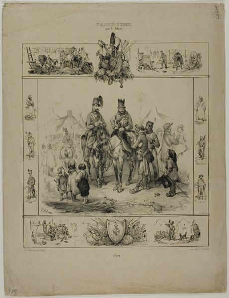 Curator: Take a look at this ink drawing, done with pen, it's a lithograph actually from 1854. We know it as “Spotprent in Amsterdamse studentenalmanak," a cartoon from an Amsterdam student almanac. Editor: Oh, my goodness, what a scene! A riot of figures crammed into the frame. It feels a bit chaotic but also purposefully theatrical, like a dark circus. Curator: Exactly. It's a caricature, so exaggeration is key. We're seeing a social commentary, rendered with a sharp, satirical wit typical of genre painting. Think about the political climate of the time – tensions, upheavals… Editor: You’re right. I can feel that tension in the almost grotesque renderings of the characters. Everyone's caught up in something... is that a mock trial at the top? The way the judges peer down adds another layer of unease. Like society is constantly judging you. Curator: Precisely. Those figures at the top do represent authority, and beneath them, there's this whole parade of people, seemingly celebrating or perhaps mocking something. There are visual metaphors that reference political upheaval and challenge established power structures. Look closely at how they are playing out instruments: there is a certain disorder in that, I think! Editor: Absolutely! This feels like one of those drawings that requires a magnifying glass. Each character seems to be acting out a specific role. What stands out to me is the use of the arch: it feels a bit macabre but still very festive for an occasion! Curator: Agreed. This artwork functions almost like a historical document. It preserves not just an image, but an attitude. The drawing would have really stirred debate, prompting reactions and shaping opinions during its time. Editor: Looking at this again, it gives you a glimpse into the humor – however dark and twisted it is – and political pulse of the era. It speaks to art’s powerful function to both entertain and instigate change. I am always a fan when images provoke you!