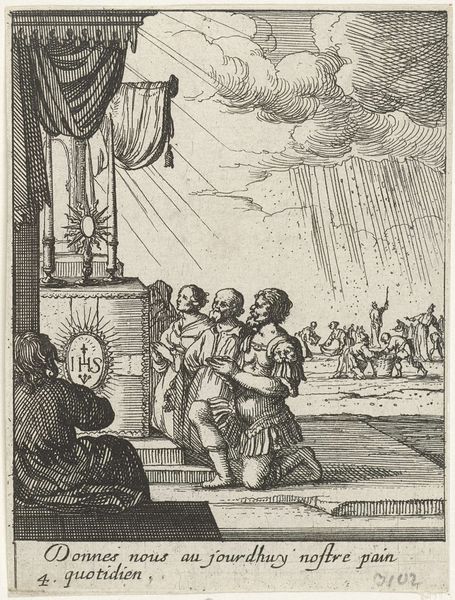 Curator: This is Jacques Callot's "Saint Gennesius," a tiny print, only about 7 centimeters tall. It depicts the baptism of Saint Gennesius. What stands out to you? Editor: It feels stark, like a freeze-frame of conversion and power. The contrast of light and shadow emphasizes the saint's vulnerability against the imposing figure of the cleric. Curator: Callot, working in the early 17th century, was deeply influenced by the political and religious turmoil of his time. This print reflects the Counter-Reformation's emphasis on saints and miracles. Editor: I see the influence. The etching technique allows for fine lines, creating textures that highlight the religious drama of the depicted scene. Curator: The choice of printmaking allowed for the broader distribution of such imagery, shaping popular perceptions of sanctity and divine power. Editor: It also speaks to the labor of image-making. Intricate details are made accessible, blurring the lines between religious propaganda and artistry. Curator: Exactly. Examining this print provides insight into the complex interplay of faith, politics, and artistic production during this period. Editor: It makes me think about how materials and processes influence meaning – even in something as seemingly straightforward as a religious scene.
