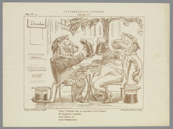 Curator: This drawing, “Spotprent nav een tentoonstelling van vrouwelijke kunstwerken te Amsterdam, 1882,” roughly translates to "Cartoon based on an exhibition of female artworks in Amsterdam, 1882" created by Johan Michaël Schmidt Crans, offers us a glimpse into the art world of the late 19th century. It's executed using pen and printed. Editor: My immediate response is amusement mixed with discomfort. The caricature style emphasizes what appears to be the artist's satirical viewpoint, but it feels pointed, maybe even a little cruel, given the context. The scale and medium are deceptive; the artist seems to want the casual feel of a comic sketch but its satirical aim is very serious. Curator: The setting—an art exhibition specifically featuring works by women—is crucial. Consider the historical context: female artists were often marginalized, their work not taken as seriously as their male counterparts. The artwork reflects societal attitudes about gender and artistic ability. Editor: Exactly. You see the text included translates roughly as "Art has no sex… or have the women segregated themselves with this exhibition in order to show that this is not true??" The question itself is dripping with bias. It points to this perception that perhaps women have isolated themselves to 'prove' something, thus revealing underlying anxiety or challenge to the established (male) status quo. Curator: And that perspective manifests in the artist's depiction. The men seem bored, perhaps critical, while the women are intensely studying the art, maybe overly so, furthering a specific narrative. I see this drawing as a reflection of institutional resistance towards recognizing female talent. Editor: The details – their clothing, the arrangement of the gallery, the inclusion of those plants almost hiding a viewer -- are telling. It feels crowded but somehow insular. Look at those sculptures lined up, it suggests both mass production but also individual artistic expression that seemingly becomes homogenized through this event. The gaze feels exclusionary and mocking, really reflecting the prevailing ideologies regarding women artists during this era. Curator: For me, it’s a strong reminder of the battles fought by female artists and how societal prejudices can be reflected in art about art. Editor: Indeed, and how seemingly simple sketches can unveil complex sociopolitical undertones that continue to be relevant as we work towards inclusive artistic environments.