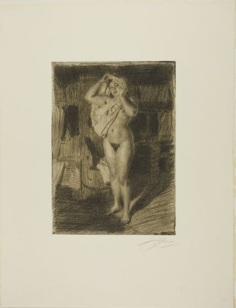 Curator: This is Anders Zorn’s etching from 1910, “Model Reading,” which you can find here at the Met. Editor: It's stark, isn't it? Raw even. It feels like a stolen moment, a glimpse into something private. Curator: Exactly. The subject, a nude woman, is depicted entirely unidealized, in a completely casual, unguarded moment while she's reading in bed. Editor: The cross-hatching adds to that feeling, that sketch-like quality. It's as if he just dashed it off, but with such intimacy. Curator: Well, Zorn was a master of capturing light and shadow through etching. The bold lines, the contrast, emphasize her form without romanticizing it. We can consider how Zorn here engages with contemporary social shifts in how women were being perceived. Editor: I see a sort of melancholic grace in the way she's framed, though. She's not posing, there is something in the texture, in the dark and light play. Curator: Absolutely. You might see echoes of Degas, even Manet, but with Zorn's distinctly Swedish sensibility. He was known for depicting everyday life. And this etching, rather unusually, complicates conventional gendered portrayals of women in art at the time. Her act of reading situates her outside simply an objectified, decorative vision. Editor: It makes you wonder what she’s reading! It almost shifts the power dynamic – she's not passively waiting; she’s engaged. Curator: Precisely. Her inward focus really pushes back against this pervasive, male-dominated gaze typical in the period's nudes. She exists within her own space, literally and metaphorically. It prompts a viewing lens rooted more in the ethos of observing lived experience. Editor: It is that resistance that holds all of my attention. This image becomes charged with stories and emotions—it makes me pause and consider. Curator: Indeed. Zorn invites us to observe the model's world. A seemingly simple sketch, it sparks conversations about intimacy, social positionality, and power dynamics within visual art. Editor: A quiet revolution rendered in stark lines. I'm leaving with so many interesting questions, actually.