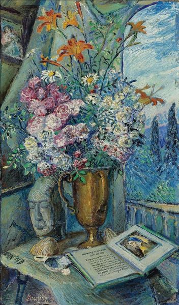 August Macke painted this untitled still life, with oil on canvas, sometime before his untimely death in the First World War. The work offers a rich display of color, a vibrant bouquet set against an abstract backdrop. Macke's involvement with Der Blaue Reiter, or The Blue Rider group, encouraged an interest in abstraction and spirituality in art. Though he was deeply influenced by the work of artists such as Kandinsky, Macke's style maintained its own distinct character. Macke was quoted as saying “It is not the object that is interesting, but the translation of nature into the abstraction of color and form.” This approach allowed him to explore the emotive and symbolic potential of color. The bold colors in the painting create a sense of joy and vitality, reflecting the influence of expressionism. The vivid colors, however, could also be interpreted as a fleeting moment of beauty against the backdrop of a world on the brink of war. The painting serves as a poignant reminder of the fragility of life and the enduring power of art.