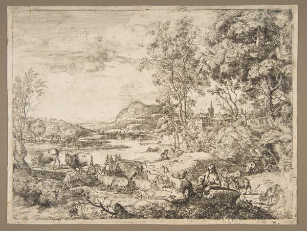 This is Claude Lorrain's etching, "The Herd at the Watering Place". Lorrain, working in 17th-century Rome, a center of artistic and intellectual exchange, was deeply influenced by the classical tradition and the natural world. Notice how the soft light dapples the pastoral scene, a shepherd stands guard as his animals drink. Lorrain’s landscapes often feel less like faithful depictions and more like constructed visions, idyllic and serene. These scenes draw from both observation and imagination. Lorrain's work became highly sought after by wealthy patrons, offering a sense of escape from the political and social unrest of the time. Although his landscapes often appear timeless, it’s worth considering who gets to imagine themselves in these spaces of leisure and tranquility. Who is included and who is excluded? This artwork invites us to reflect on our relationship with nature. It asks who has access to its beauty, and what role art plays in shaping our perceptions.