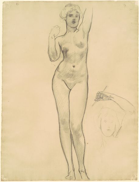 Editor: This is Augustus Vincent Tack's "Nude Female Torso," dating from around 1900, created using pencil. It's a fairly straightforward drawing, but I’m struck by how vulnerable and incomplete it feels. How do you interpret this work? Curator: It’s interesting you mention vulnerability. Let's think about this drawing within the historical context of the early 20th century. The academic tradition often objectified the female form, presenting it as an ideal. However, Tack's rendering, with its unfinished quality and visible pencil strokes, seems to offer something different. What does this fragment reveal about the gaze of the artist and the power dynamics at play when representing the human body? Editor: I hadn't really thought about it like that. I suppose it does avoid idealization in some ways, presenting a more immediate, perhaps even honest, representation. The lack of a face is intriguing. Is it an intentional de-personalization? Curator: Precisely. It prompts us to consider the politics of representation itself. Who is given a face, a voice, a complete identity, and who is reduced to a body? Tack, perhaps unconsciously, is engaging with questions of gender, power, and the artistic canon. Think about the ways in which women artists at the time were fighting for recognition, for the right to represent themselves. Does this drawing echo some of those struggles? Editor: It's a more loaded piece than I initially gave it credit for. Considering its historical context really brings out those layers of meaning. Curator: Absolutely. By engaging with the historical and social forces shaping the artwork, we can begin to understand its broader significance and relevance to contemporary discussions around identity and representation. Editor: This has been super insightful, highlighting the importance of contextualizing artworks within their time and considering their potential political implications. Thanks!
