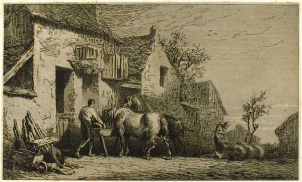 Editor: This engraving, "Vier geiten en een schaap bij een huis," or "Four Goats and a Sheep by a House," by Johannes Mock, dates sometime between 1810 and 1884. It’s a charming scene, almost like a snapshot of rural life. What historical context is crucial for understanding a piece like this? Curator: The charm, as you say, is key. Remember this was during a rise in urbanization. Scenes like these, depicting seemingly simple rural existence, became increasingly popular, didn't they? Consider how the artwork idealizes country life for an urban audience. How do you think the depiction of these animals contributes to this idealization? Editor: I suppose it’s a way of romanticizing nature, emphasizing the pastoral and peaceful. But wouldn't a realistic portrayal include, perhaps, the hardships or realities of farming? Curator: Exactly! And that omission is precisely where the ideology lies. It's a carefully curated image, meant to evoke nostalgia and perhaps even downplay the socio-economic inequalities present at the time. Think about who commissioned and consumed these images. Editor: So, it's not just a simple drawing of animals. It reflects the politics of its time, showcasing what the elite wanted to believe about rural life, regardless of its accuracy. The very act of choosing this subject becomes a statement. Curator: Precisely. Art doesn't exist in a vacuum. What seems like a quaint scene actually speaks volumes about social anxieties and power structures of its time. Editor: I see this engraving in a completely new light. It’s not just art imitating life; it's art shaping perceptions and reinforcing social narratives. Curator: Indeed! Keep questioning what realities artworks try to depict!