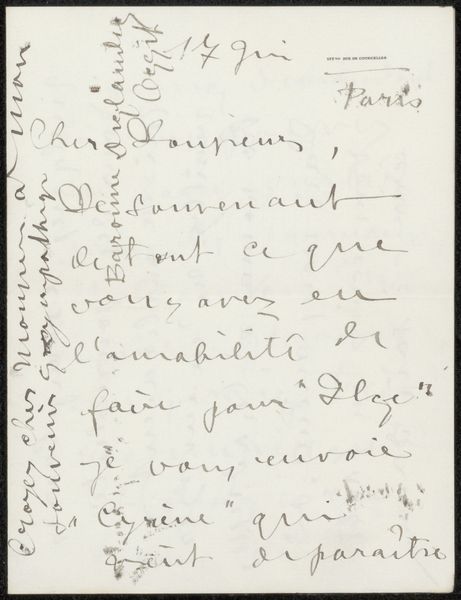 This is "Brief aan Philip Zilcken," a letter created by Baronne Madeleine Deslandes. The overall visual experience is defined by a surface densely covered in elegant, flowing script. The color palette is simple: dark ink on a light background, creating a stark contrast that emphasizes the texture of the paper and the rhythm of the handwriting. Deslandes's composition disregards traditional notions of structure, with text cascading across the page, defying a linear reading. The varying pressure and speed of the pen strokes introduce an element of chance, challenging the stability of language itself. The structuralist might see in this a deconstruction of the conventional letter form, undermining its function as a clear, communicative tool. Ultimately, the formal qualities of this letter, its chaotic yet controlled composition, reflect a broader engagement with the instability of meaning. It’s a performance on the page, a visual representation of thought in motion.