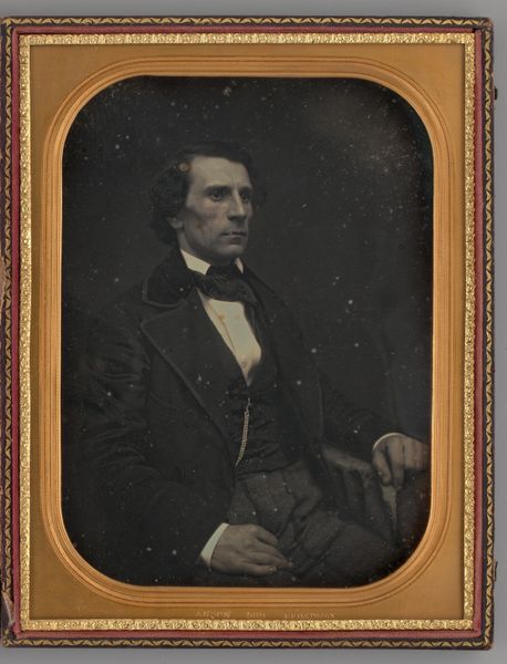 This is a portrait of an unknown man by Joseph Maes, captured with photography. The sepia tones immediately give a sense of the past. It shows a man in a suit with a patterned background. The composition is quite formal, typical of portraiture of this era, with the subject positioned almost centrally. Note the geometric shapes in the furniture—the circles and spirals of the chair echo similar shapes in the table legs. This repetition creates visual harmony, suggesting a structured, bourgeois world. The photograph also operates as a semiotic system. The man’s attire, his composed stance, and the ornate furniture around him all signify wealth and status. These are cultural codes understood by viewers, which may reflect broader social structures and power dynamics of the time. Consider how the photograph's structured composition and symbolic elements come together. They create a narrative of identity and social standing. While the subject remains unknown, the photograph continues to engage us with its formal qualities, offering a rich field for interpretation.
