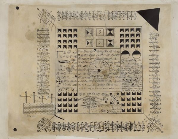 Curator: The artwork before us, “Promulgation of the Contemporary Tea Ceremony,” created in 1694 by Endō Genkan, offers a fascinating look into the aesthetics and practices of its time. What do you notice first? Editor: The immediacy. The quick, almost frenetic linework, combined with the aged paper creates an impression of something very intimate, like a personal sketchbook. There’s an interesting dance between the structured elements, like the grid on the left page, and more organic shapes on the right. Curator: Exactly. These personal sketchbooks or "ukiyo-e" as they were sometimes called, served not just as records but also as tools to popularize cultural practices. In this case, the evolving tea ceremony. Editor: It seems as though we’re seeing instructions laid bare. The architectural drawing of the tea house and the scattering of forms remind me of a sort of exploded diagram, where the viewer is meant to piece together the components. Curator: Yes, it's both documentation and perhaps a mnemonic aid for those learning the nuances of the ceremony. It also offers a glimpse into the social currency of tea at that moment in Japan. A ritual undergoing constant revision and reinterpretation to stay relevant. Editor: You can also see it on the material level; it’s a rather casual deployment of line to create texture. There's a rawness to the sketchbook that I appreciate. Curator: Agreed, its power comes from how the spontaneity captures a moment in time, the culture shifts occurring when Endō Genkan made it. Editor: This sketchwork feels so alive. Curator: It gives us insight into the cultural and societal weight that something as simple as tea could carry. Editor: Indeed, an excellent marriage of function and aesthetics.