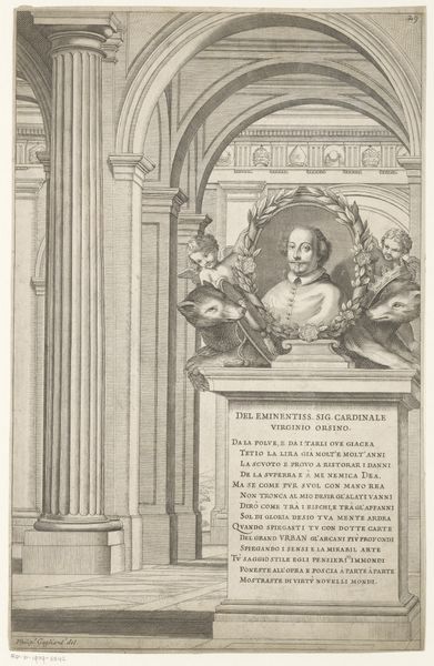 Curator: What strikes me first is the sheer graphic quality – the sharp lines and the contrast between the architectural elements and the softer portrait. It feels very dramatic. Editor: Indeed. This engraving, dating back to 1642, is titled "Monument voor kardinaal Marco Antonio Franciotti". You can find it here at the Rijksmuseum. What is particularly compelling is how the built form serves as a commemoration, effectively merging architecture and memorial. Curator: Absolutely. The architectural elements are fascinating in their own right. Look at the perspective, for instance – the receding arches draw the eye deep into the image. The level of detail achieved through the engraving process is extraordinary. How does the choice of architecture itself function? Editor: Given the cardinal’s position, it is likely that the design references contemporary trends in Baroque church design. The epigram on the plaque offers additional meaning to be revealed. The monument may function to immortalize the figure and express cultural power, considering also that its presence as an engraving allowed the artwork to disseminate this cultural power beyond any local monument itself. Curator: Right. The contrast is especially interesting when you compare it to the cardinal's portrait. He appears more delicate than the hard marble surrounding him. It begs the question, what kind of labor went into translating the likeness into the image? And, thinking more broadly, what statement is being made through this carefully crafted object, a reproducible and, hence, a distributable image? Editor: The materiality of the print certainly dictates our perception. The medium limits detail but accentuates the formal aspects of shape and line, leading to that distinct emotional power, that dramatic flair we noted initially. Curator: I think focusing on those lines really tells us something about the impact of production and how the Baroque as a global style gained prominence by way of distributed works like this one. Editor: Precisely, each perspective adds to the appreciation of a piece like this.