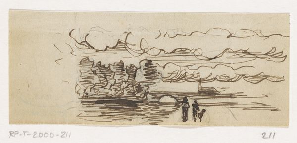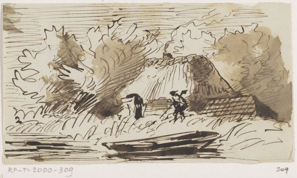 Editor: This is Rodolphe Bresdin's "Landscape with Mountains," a small pen and ink drawing. It's so stark and evocative. What strikes you about it? Curator: Bresdin's landscapes weren't simply observations; they were often charged with symbolic meaning, reflecting his radical politics and critique of societal power structures. Consider the scale – the mountains dwarf any human presence. Editor: So, is the landscape a metaphor? Curator: It could represent the overwhelming forces of nature, or perhaps even the oppressive structures of 19th-century society that Bresdin resisted. How does that reading resonate with you? Editor: That tension between nature and society really comes through now. Thanks for pointing it out! Curator: It invites us to question our place within these broader systems. It's a call to engagement.