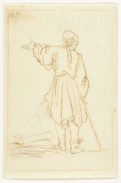 Editor: This is George Chambers' "Dutch Sailor, Carrying an Anchor," created sometime between 1820 and 1830. It's a drawing made with graphite, colored pencil and pencil on paper. It feels quite understated, almost like a quick sketch, yet there's a definite character captured. What do you see in the way the artist has rendered this figure? Curator: The formal elements immediately strike me. Note the stark economy of line; Chambers has managed to convey volume and texture with minimal strokes. Observe how the figure is placed within the frame, neither dominating it nor lost within it, thus creating a spatial tension that is central to the artwork. The choice of colored pencil enhances specific details such as the face, hat and the end of the anchor, drawing our eye to focal points in the narrative structure, almost akin to applying dramatic makeup. Editor: I hadn't really considered the importance of that negative space. Does the flatness of the background emphasize the realism of the figure by contrast? Curator: Indeed. We can appreciate how the contrast between line, colour and surface serves a fundamental purpose. In structuralist terms, Chambers employs these elements almost like linguistic signs that create meaning and allow us to interpret the relation between space and figure. Look, too, at the subtle modelling. How does this formal device serve the composition as a whole? Editor: It guides your eye around the form of the sailor, giving him weight and presence within this minimal space, I guess. I’m starting to appreciate the subtleties of this piece! Curator: Precisely. It’s a testament to how even seemingly simple works can reveal complexity upon deeper structural and semiotic inspection. I’ve come to think about narrative in art quite differently today.