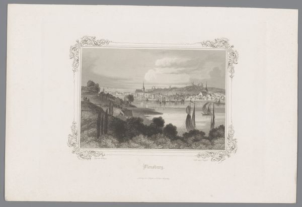 Georg Michael Kurz created this detailed view of Kiel using etching techniques sometime in the 19th century. Note how the composition pulls you in with its symmetrical arrangement, framed by a decorative border. This creates a classical window onto the scene. The visual structure is meticulously organized along the horizontal and vertical axes. See how Kurz balances the landscape, positioning the city against the water, bisected by the horizon line. Light and shadow play a crucial role; the darker foreground, with its detailed foliage and figures, contrasts with the lighter, airy cityscape, creating depth and perspective. This contrast isn’t just aesthetic, it sets up a structural opposition between nature and culture, the immediate and the distant, inviting contemplation on how we perceive and categorize our environment. Note how the intricate detailing invites closer inspection, even as the broader view encompasses the city's silhouette against the sky. The artwork is not simply a depiction but an invitation to explore how we construct meaning through visual contrasts.