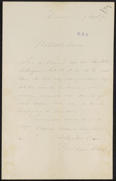 Editor: We’re looking at "Brief aan Frans Buffa en Zonen" by Hendrik Albert van Trigt, probably from 1875. It’s an ink drawing on paper. It’s a letter, and even though I can't read Dutch fluently, the handwriting is so elegant, almost like an artwork in itself. What resonates with you about this piece? Curator: Handwriting as art, yes! This letter speaks volumes even beyond its literal content. Consider the act of writing itself in 1875. Each stroke of the pen, each carefully formed letter, represents a deliberate connection between the sender and recipient. Look at the flourishes and the consistency of the script – what might those stylistic choices communicate about the author's social standing, their relationship to Frans Buffa en Zonen, or their personal identity? Editor: I guess it suggests a certain level of education and refinement. But could it also tell us something about their emotions or state of mind? Curator: Precisely! Handwriting has always been seen as a mirror to the soul. The pressure applied to the pen, the slant of the letters, even the spaces between words, could all be interpreted as visual metaphors for inner states: confidence, anxiety, perhaps even deception. Think of the symbolic weight we still give to signatures today. They stand in for our very selves. What’s also interesting here is that a letter of communication can be, and is, an artifact worthy of museum display. Editor: That’s a great point, how everyday items carry so much significance. I will never look at handwriting the same way! Curator: And that is why art, and its symbols, are timeless!