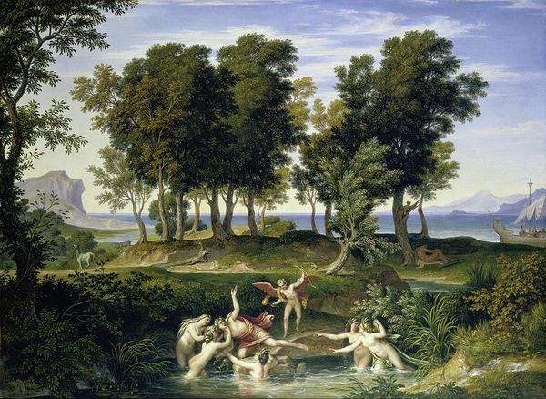 Editor: This is Jan Brueghel the Elder's "Allegory of Water," rendered in oil paint. It’s quite a busy scene, isn't it? The composition, with the nude figure and the river teeming with life, is striking. What do you see in this piece from a formalist point of view? Curator: The formal structure is immediately arresting. Observe the carefully constructed recession of space, from the detailed foreground bursting with life to the atmospheric haze of the background. This juxtaposition creates a tension between surface detail and illusionistic depth, challenging the viewer’s eye. Editor: I notice how the colours shift gradually... Curator: Precisely! Consider the colour palette. Brueghel orchestrates a delicate balance, transitioning from the verdant greens and browns of the terrestrial landscape to the silvery blues and greys of the water. This division highlights a duality within the element itself - earthly fecundity versus ethereal expanse. How does this resonate with your perception of water as a theme? Editor: I hadn’t really thought of the painting like that. It seemed simply decorative before, but now I see a structure and deliberate colour-coded contrast that builds thematic contrast! Curator: Indeed. Brueghel’s Allegory reveals the way form can shape, support and reveal intended significance. What was merely 'decorative' becomes an arena for a fascinating and deep theoretical dialogue, which is also personally striking in its own visual terms. Editor: I'll never look at another landscape the same way. It's fascinating to think about structure and composition intentionally driving narrative like this!