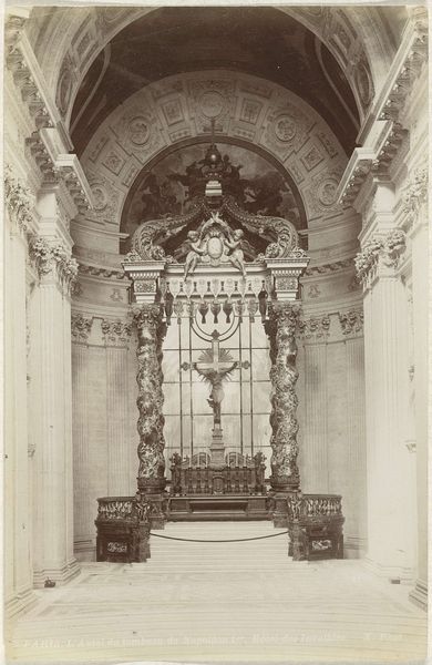 Editor: This is a photograph entitled "Interieur van de Kapel van Suffragi op de begraafplaats van Staglieno in Genua" by Alfredo Noack, dating from around 1870 to 1890. It’s an albumen print, so it has this lovely sepia tone that gives it a very solemn feel. It really highlights the architectural grandeur and intricate details of the chapel. What do you see in this piece? Curator: Ah, yes, Noack. He had an eye for the sublime. The stillness is palpable, isn't it? The way the light drapes itself over the statues... almost as if they're caught in a perpetual moment of reflection. Do you get that sense? This wasn't just about documenting a place; it was about capturing a mood, a conversation with mortality itself. It’s fascinating how photography at the time became a medium for reflecting on death, loss, and memory, what do you think? Editor: It definitely makes you think. I suppose because it is a mortuary chapel. The symmetry of the columns and the geometry of the floor are impressive too. It gives it an imposing and somehow reassuring feel? Curator: Imposing is spot on! I also notice how Noack’s classicist style really amplifies the dialogue between space and stillness. Imagine the people who stood there… and I wonder: Were they overwhelmed by the artistic craft on display or contemplating the mysteries of existence? Editor: It makes me wonder if Noack consciously wanted to achieve this particular sense of place… the mood he captures really speaks to the art of seeing. Curator: Exactly! He invites us to engage with space. To perceive its resonance and allow ourselves to meditate on existence. Thanks! I hadn't considered Noack's invitation to meditate so thoroughly.