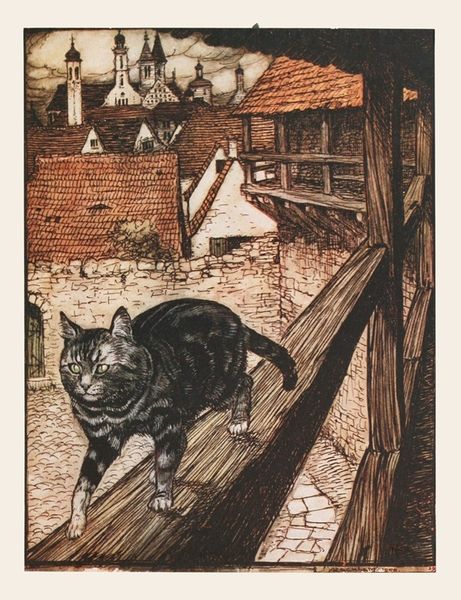 Editor: So, this is "Once there was a poor old woman who lived in a village" by Arthur Rackham, from 1920, created with watercolor, ink, and drawing on paper. I'm struck by the delicate lines, but also the rather melancholic feel to the work. What symbols or meanings jump out at you when you look at this illustration? Curator: The bent figure of the woman is laden with meaning, isn’t it? It evokes countless images of poverty, hardship, and even the archetype of the crone figure in folklore. The city itself is fascinating, reflecting an antiquated world that could signal societal decay or a persistent memory. Look at how the buildings seem to almost lean in towards her, almost enclosing her. Do you think that this enclosure is intentional? Editor: It definitely adds to the feeling of oppression. It almost feels like the city itself is weighing down on her. The waterway visible through the archway...is that symbolic too? Curator: Water, especially in a fairytale context, often represents the subconscious or a journey, perhaps one she cannot embark on. The small boat suggests possibilities, escape perhaps. But does she see it? Does she have the strength for the journey? Notice the placement of the lamp. Light in art is powerful. Editor: It’s right there, almost above her head, offering guidance? Curator: Possibly, yes. The illustrator leaves clues and traces of continuity. But do the light, the potential of the water, pierce through the weight of the buildings? These images work on us psychologically, tapping into anxieties about aging, poverty, and the unknown. Rackham provides no simple answers; his illustrations linger. Editor: This makes me see beyond the surface. It’s not just a picture of a sad old woman; it’s a collection of symbols representing universal struggles. Curator: Precisely! It uses what's visible to speak to invisible realities, a dialogue between what we see, what we think, and what we feel.