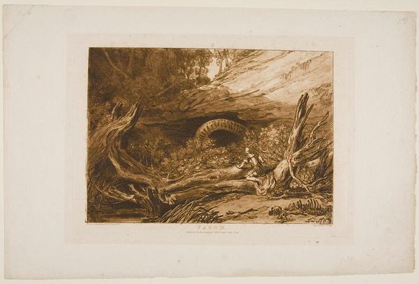 Curator: This is J.M.W. Turner's etching, "Jason," housed here at the Harvard Art Museums. Editor: It feels like a landscape viewed through a very dark dream—dense, brooding. Curator: Indeed. The process itself, etching, allowed for the mass production of images and wider distribution. Note how the density of lines creates such a textured surface. Editor: Yes, and the skeletal remains in the foreground—they create a sense of mortality, like nature reclaiming everything. It whispers about the transience of life. Curator: Turner was deeply engaged with the industrial revolution and its impact on the landscape. We can see how he portrays nature, both sublime and ravaged. Editor: So it's a commentary on progress, perhaps? The beauty intertwined with decay? Curator: Precisely. Examining the labor and material processes offers insight into these themes. Editor: It’s fascinating how much emotion he conveys with such stark lines and the material constraints of printmaking. Curator: Absolutely, and it's rewarding to consider Turner's social context and intent. Editor: I am left pondering how much nature shapes us, or we shape it.