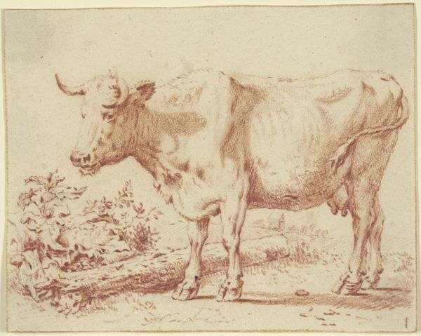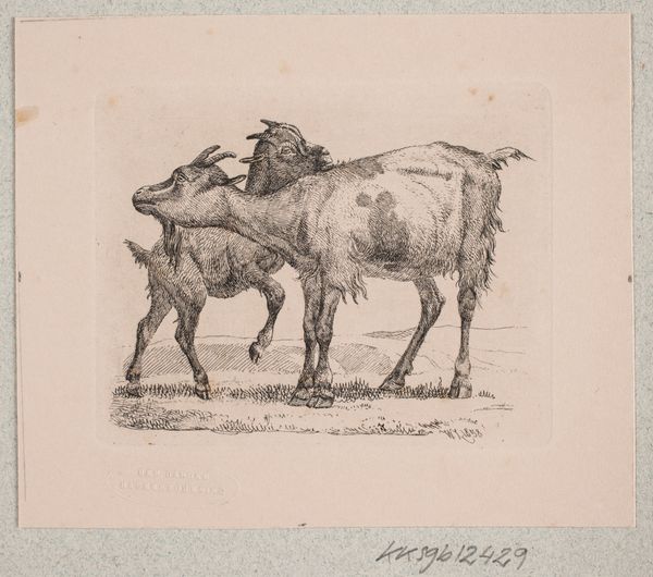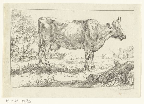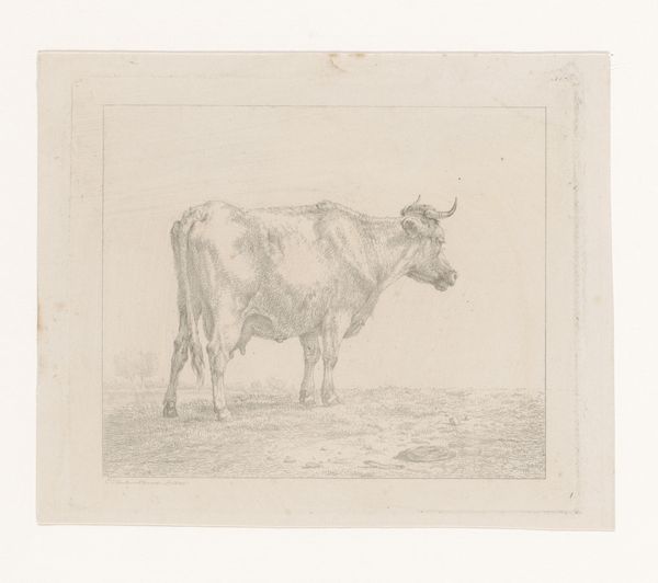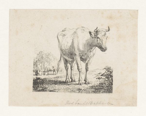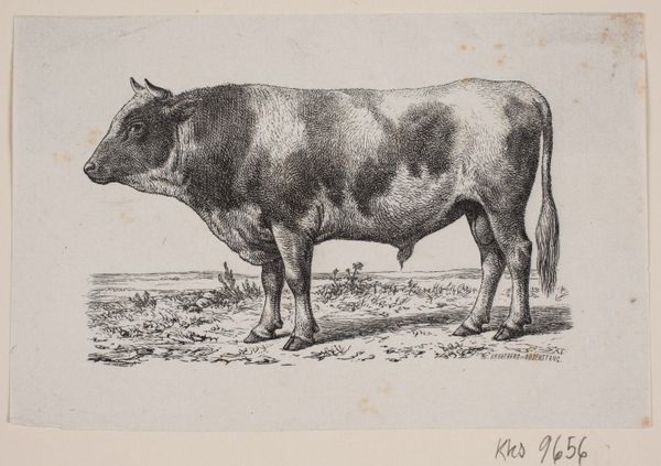 This print, En ko, or A cow, was made by Johannes Wilhelm Zillen in the 19th century. It's an etching, meaning the artist used acid to cut lines into a metal plate, which was then inked and printed. The stark black lines on the paper give the cow a strong presence. The fine lines capture the animal's form, emphasizing the texture of its hide and the way it stands in the field, as well as the plants in the foreground, and the distant hills. Etching was a popular medium during this time, and was used to reproduce images quickly and inexpensively. The method allowed artists to create multiple copies of their work, making it accessible to a wider audience. This print reflects the social context of the time, where images of rural life and animals were in demand. Looking at the materials and the way this print was made helps us appreciate the skill involved, and consider how it connects to broader cultural trends. It challenges us to think beyond traditional definitions of fine art, and recognize the value in everyday imagery.