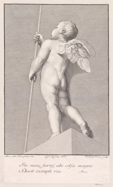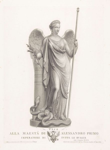 Editor: So, this is "Ontwerp voor een standbeeld: Overwinning" by Bartholomeus Ziesenis, created in 1799. It's an ink drawing on paper. There's a winged figure of Victory holding a wreath. It’s a preparatory drawing, it seems... the statue would presumably have been stone. I’m really struck by the use of a comparatively "cheap" material like ink and paper to design such an ostentatious display piece. How can that inform how we approach it? Curator: Exactly! It's critical to consider the materiality. Ink and paper allowed Ziesenis to rapidly prototype his concept for a monument celebrating triumph. Consider the labor involved; a drawing is relatively quick compared to carving marble. How does this influence your reading of the subject? Editor: Well, I guess it highlights the distance between the ideal of "victory," a finished monument of enduring stone, and the preliminary labor and materials needed to visualize and realize it. Does the apparent delicacy of ink on paper offer a commentary on the supposed permanence of triumph? Curator: An insightful interpretation. Let's push further: how does the mass production of paper in the late 18th century, alongside the skilled labor required for detailed ink work, shape your understanding of this piece as a commodity and a symbol? Think about access and distribution. Editor: So, on the one hand, the image of "Victory" conveys an elite concept of power and commemoration, yet the actual drawing becomes reproducible, accessible potentially to a wider audience. That contrast feels very charged. Curator: Precisely. It invites us to think about the social dynamics of art production and reception in a time of revolution and changing class structures. Editor: I never considered that such a drawing might carry implications of both artistic vision and its mass dissemination as well. It feels much more complex now! Curator: And that complexity, recognizing both the artist’s intention and the influence of material reality and consumption, is the rewarding challenge of art history.