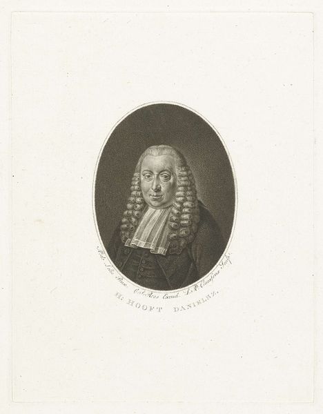 Curator: Welcome to the Rijksmuseum. Before us is a detailed engraving, a portrait from the late 18th or early 19th century. The piece is titled "Portret van de werktuigkundige Cornelis Redelijkheid," dating from 1752 to 1823, and it's attributed to Johannes Cornelis Mertens. Editor: Oh, hello there, Mr. Redelijkheid! He's got that "I've seen things" look in his eyes. Seriously, though, there's an undeniable seriousness etched on his face, a kind of weary wisdom that piques my curiosity. And the fine lines of the engraving add to that weightiness. Curator: Precisely. Mertens captured that mood quite well, I think. From a formalist perspective, the use of the oval frame is particularly striking. It softens what could have been a severe depiction, a neoclassical style. It serves to draw your attention to the subject’s face and the details of his clothing. Editor: Good point. It’s all contained, like a thought bubble hovering just above the page. Tell me more about his clothing – a peek into the period's sartorial elegance, perhaps? Curator: The attention to detail is impressive. His coat, vest, and neatly tied cravat provide insight into the clothing of the era. The subject's neatly powdered hair adds to that classic picture. The sharp lines suggesting his uniform is beautifully rendered, displaying the engraver’s skill. Editor: It feels so clean and crisp, doesn’t it? Even with the clear gravity in his expression, it maintains a polished veneer. Is that perhaps something to do with this "neoclassical" tag? A way to keep appearances despite the storms of history swirling around? Curator: I believe so. Neoclassicism often sought to evoke a sense of order and rationality, which may have been a desired contrast with the turbulence of the times. Mertens provides not just a portrait but a window into a particular historical consciousness. Editor: Right! It's almost as though it's not only a portrait but a statement. Like history trying to keep a stiff upper lip and perfectly coiffed hair in the face of, well, everything! Well, I'm truly grateful for this little window into another person's universe. Time well spent. Curator: And I believe we've offered our visitors a worthwhile insight into the era's cultural currents via form, figure, and context. Thanks for listening!