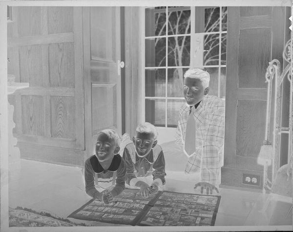 Editor: Here we have an untitled photo by Lucian and Mary Brown, a silver gelatin print of a family on a couch. It's hard to tell with the negative, but there’s a clear emphasis on the domestic space and the family's presentation. What stands out to you? Curator: The labor embedded in creating and maintaining this image is significant. Consider the economic context. What materials are visible: the floral couch, the clothing, the decoration on the wall? Editor: So, you’re focusing on the material aspects as a reflection of their social and economic standing? Curator: Precisely. The print itself, a reproducible commodity, becomes a marker of aspiration and a curated representation of family life, made accessible through photographic technology and the labor involved in its production and consumption. Editor: I never thought about a photograph that way before. Curator: Considering the means of production can reveal hidden social dynamics.