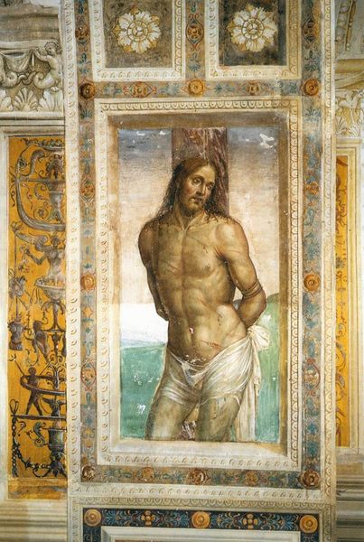 Editor: We’re looking at Ambrogio Bergognone’s "Christ Rising from the Tomb," painted around 1490, in oil. It strikes me as both serene and powerful, especially Christ’s gaze. What do you see in this piece, particularly when considering its Italian Renaissance context? Curator: I see a fascinating negotiation between the divine subject and the material realities of its creation. Notice the almost tactile quality of the drapery – how Bergognone uses oil paint to create folds and textures that invite a physical interaction, even though we know this is meant to depict a spiritual event. It begs the question: how does the artist's choice of materials and techniques reinforce or perhaps even subtly subvert the religious message? Editor: That’s interesting. The drapery *is* so detailed; you almost forget it’s oil on panel. Does the material quality have any socio-economic implications here? Curator: Absolutely. The use of oil paint, relatively new at the time, speaks to a patron who could afford such a costly material. Furthermore, the level of detail suggests significant time and labor investment. We must ask: who was Bergognone painting for, and what did *they* want to convey through this opulent display of skill and material wealth? Consider, too, the skilled labor of preparing pigments, the craft of the panel maker – all these contribute to the final “spiritual” product. Editor: So, it's not just about divine representation, but also about earthly production and consumption. It sounds like even religious art served specific class interests? Curator: Precisely! We shouldn't divorce the artwork from its conditions of production. Even a depiction of the resurrected Christ is fundamentally tied to the earthly realms of material, labor, and social power. It’s fascinating, really. Editor: It changes how I see the piece. I was focused on the religious meaning, but now I'm also considering who paid for the materials and labor. Thanks for sharing your insight. Curator: And thank you for helping me see how traditional interpretations sometimes overlook the socio-economic dimensions of art.