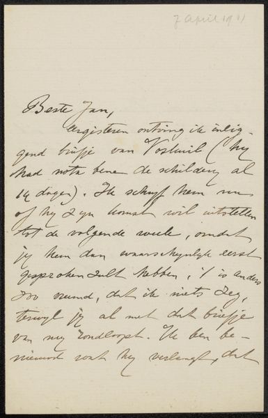 Curator: What strikes me first is the immediacy of it, like catching someone in a moment of private correspondence. It's intimate. Editor: We’re looking at "Brief aan Philip Zilcken", possibly created around 1894. William Macbeth penned this using ink on paper; it's technically categorized as a drawing. Beyond the visual aesthetic, let's consider the conditions of its production, you know, Macbeth's social positioning, his intended audience, Zilcken. Curator: Yes, exactly! It feels as though you almost shouldn't be reading it. I mean, it's literally someone else's mail. Do you get that feeling or is it just me? Editor: Think about Macbeth and the market, too. His gallery dealt with "pictures in oil and water colors." Was this drawing just a functional business communication, or could it be perceived as another artful output, especially in that moment? Consider paper as a commodity, and the relative cost of penning personal missives at the time. Curator: I’m caught up by how easily the personal and the professional blend. He mentions "the little matter about your picture" but frames the settlement taking "as much time as the making of a big treaty between nations." I love how the grand and the everyday intertwine. It's so familiar, so human. I would even describe it as witty! Editor: Precisely. I'm considering this artwork within a network, tracing how information, images, and capital flowed, as well as materials such as the paper and ink that made it possible. So many hands and tools and marketplaces were responsible for producing this humble object that you call intimate. Curator: It reminds me that art isn’t created in a vacuum. There's this ripple effect outwards. You have the artwork itself, of course, and the circumstances of the materials; but ultimately you're also sharing it with audiences generations on. In that context, it's fascinating, isn’t it? Editor: Exactly. Every art piece becomes a kind of artifact, reflecting a precise dance between maker, matter, and moment.