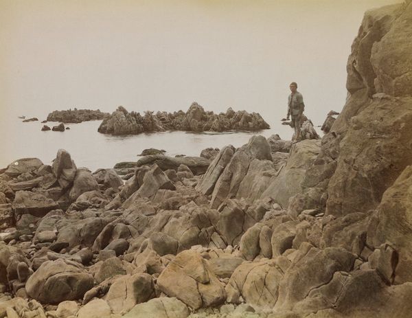 This photograph, "Gezicht op de haven van Bestrée bij de Pointe du Raz" by Delizy, presents a vista of a rocky coastline. It's rendered in muted sepia tones that emphasize the natural textures of stone and water. The composition leads the eye from the solid, near rocks into the misty distance. The photograph’s structure reveals a study in contrasts: the rough, tangible rocks against the fluid, intangible sea. This tension embodies a play between the known and the unknown, the finite and the infinite. The tones may suggest a commentary on the Romantic era's sublime landscapes, but here, nature is presented in a more subdued, observational manner. Consider how the photographer's perspective, high above the scene, might invite questions about our relationship to nature. Are we observers, controllers, or simply participants? The photograph encourages contemplation on these themes, framing a natural setting within the bounds of human perception and interpretation.