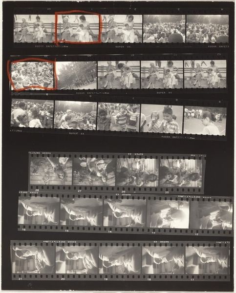 Curator: This is "Vogue women--New York City 10", a gelatin silver print created by Robert Frank between 1952 and 1953. Editor: Oh, interesting! It’s… a collection of moments, almost like a storyboard. The high contrast is immediately striking, all those long shadows... It gives this feeling of being slightly off-kilter, a little unnerving. Curator: That disquieting feeling, I think, comes from the way Frank captures fleeting moments of urban life. It's not posed, it’s raw. I would like to connect the dots between his personal history, escaping Nazi Germany, and the feeling of searching, longing, that imbues his photographic essay, *The Americans*. The artist used the visual diary as his medium to capture personal experiences. Editor: I can see that. The shadows are particularly dominant; they seem to stretch and distort reality. You mentioned the fleeting moments and they convey how these silhouetted figures symbolize the alienation inherent in capitalist structures... This resonates even more powerfully considering it was published post-war and it is also an inquiry on race, gender, and class. What do you make of the red markings? Curator: I suppose those red markings serve as windows into Frank’s editing process. There are about forty images on this one print. By including this printing proof sheet into a finalized piece he suggests he did not choose only one frame that meets an expectation of formal excellence or beauty but he considers the sum of its parts instead. To me it's evidence that this photographic collage is far more like poetry and free expression than a composed landscape. Editor: I agree that those traces reveal a certain deliberate artistic gesture. I feel, thinking of urban experiences in general, one finds oneself constantly curating what is relevant for daily navigation and what to omit… Curator: True. Thank you. I think paying closer attention to Frank's work always pulls me back into the density and speed of life. Editor: Definitely, there's an underlying commentary on surveillance and power structures, especially relevant now. These “Vogue women” become spectres in a city that doesn't belong to them. Curator: What a resonant note. It brings it all home. Thank you for this thoughtful, grounded conversation.