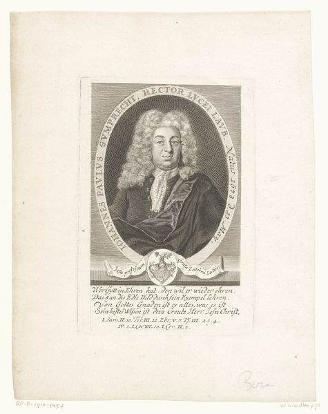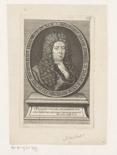 Editor: Here we have Johann Martin Bernigeroth's "Portret van Wilhelm Friedrich von Pistorius," an engraving from 1734 currently held at the Rijksmuseum. I am struck by how this print visualizes power through very deliberate methods. How would you interpret its function and historical position? Curator: Indeed. Prints like these played a crucial role in shaping public perception and disseminating images of power in the 18th century. The fact that this portrait, rendered as an engraving, was reproducible allows us to consider it not just as a likeness, but as a statement. Look at the framing oval, it's reminiscent of Roman cameos and thus classical virtue. What might that suggest? Editor: Well, I guess it tries to connect the subject to those ideals of leadership from antiquity. So, it's less about what Pistorius looked like and more about promoting a certain image, am I right? Curator: Precisely! Bernigeroth is consciously participating in image construction. Pistorius isn't just anyone; he is a member of the elite, signified through composition and adornment. And engraving as a medium democratizes that constructed image through reproducibility. This would have influenced public perception and reinforced social hierarchies. Do you see how museums, like the Rijksmuseum where this piece is today, are actively shaping history through what they acquire and present? Editor: That makes perfect sense. I initially viewed this piece through the lens of aesthetics and technique, but I can now see the intentionality behind its creation and circulation. Curator: Exactly, every artistic decision reflects broader social, political, and institutional forces at play. Museums play a powerful role.