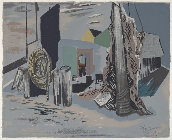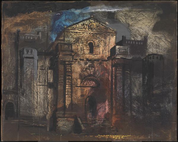 Editor: Here we have John Piper's "All Saints Chapel, Bath," from the Tate Collection. It looks like watercolor and ink on paper. The mood is somber, almost ruinous. What can you tell me about it? Curator: Notice how Piper uses the materiality of watercolor—its fluidity and unpredictability—to depict architectural decay. This chapel isn’t just a building; it's a site of labor, a repository of social values crumbling before our eyes. Editor: So, it's not just about the pretty gothic details? Curator: Precisely. Consider the process: the quick, gestural marks suggest a rapid transformation, maybe even violent destruction. What was once solid is now debris, reflecting a changing landscape of belief and production. Editor: I see what you mean. It makes me think about the cost of progress. Curator: Indeed. Piper’s work encourages us to question what we build, what we value, and what gets left behind in the process.