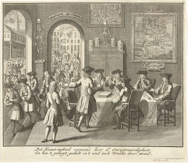 Editor: This print, titled "The Banquet for the Return of the Prodigal Son," dates back to the 1630s and is attributed to an anonymous artist. It seems to be an engraving on laid paper, depicting a scene filled with figures and architectural details. There's a definite sense of wealth and celebration, but something feels a little… staged. What do you see in this piece? Curator: Well, considering this piece through a historical lens, it's fascinating to consider its public function. The prodigal son was a key element of post-Reformation Catholic teachings about contrition, repentance, and forgiveness, at a time when families used fine and decorative art as a form of messaging, demonstrating their values in a post-Reformation cultural climate, in relationship to public morality, civic duty, and religious piety. This looks like the representation of wealth. Are these supposed to be moral and admirable? Editor: So, it’s more than just showing a happy family reunion. You are saying that It might be sending signals about values. Like, 'Look how generous and pious we are!' I guess the opulence struck me the wrong way initially. Curator: Exactly. Think of the socio-political context. The print itself, its availability, and the people it represents also factor into play here. Who had access to prints like these, and what messages were they internalizing about social hierarchy and religious devotion? Do you see how the architecture and fine details communicate that? Editor: That's really insightful. It changes the way I see the image – it's not just a Biblical scene, but a statement about societal power and influence being marketed to people. Thanks! Curator: Precisely! I am pleased to give you the opportunity to think of those parameters. It allows a more holistic, cultural perspective.