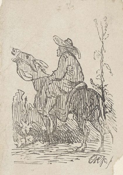 Editor: This is "Man on Horseback," an engraving by John-Lewis Brown, placing its creation somewhere between 1847 and 1890. It’s currently housed in the Met. I'm immediately struck by the rather stark and lonely impression it gives off, mostly in tones of gray. What’s your take on it? Curator: Lonely is an interesting word. I think Brown captures a feeling more akin to stoicism here. There’s something resolute in the angle of the man’s back, the set of his shoulders. It's a romanticized figure but a little different from many equestrian works. This isn't a conquering hero. Do you get a sense of where he might be going, or what he's doing? Editor: I don't know, but I see the weapon, so, my initial guess is that he's a soldier on patrol or en route to a battle. Curator: Yes, perhaps, or simply on a hunt, since those activities often overlapped historically. What intrigues me are the technical choices Brown makes. He is very focused on this idea of creating many fine lines through engraving; this gives us very nuanced light and shadows. Note the landscape – it's suggested with incredibly economical strokes, almost as an afterthought to the figure and his mount. Does it speak to a particular romantic trope for you? Editor: I think so. It reminds me a little bit of the wandering artist trope in Romanticism - alone and in contemplation. That said, I hadn't even considered the technicality of engraving as being a purposeful choice. Curator: Right! And considering the laborious nature of the engraving process makes the swift, sure strokes describing the landscape even more compelling, don’t you think? Editor: I absolutely agree, thank you for helping me notice what could be easily overlooked!