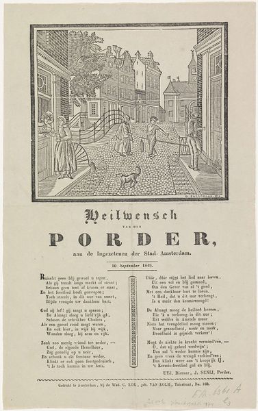 This is "Nieuwjaarswens van de Amsterdamse porders voor het jaar 1849," or "New Year's Greetings from the Amsterdam Porters for the Year 1849", made by an anonymous artist. This print offers a glimpse into the social hierarchy of 19th-century Amsterdam. The image depicts "porders," or porters, who were essentially day laborers, conveying their New Year's greetings. These greetings were often a performative act, a means for the working class to seek favor and tips from wealthier residents. The text below the image reinforces this dynamic, with verses expressing wishes for prosperity and divine favor upon the recipients of the greeting. It speaks to the intersections of class and religion, highlighting the prevailing social norms and the economic realities that shaped everyday interactions. The emotional weight of this piece lies in the hopes and aspirations of those who lived in a society starkly divided by wealth. This artwork serves as a poignant reminder of the complex relationships between labor, patronage, and social expectation in the historical context of Amsterdam.