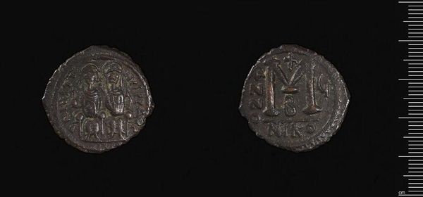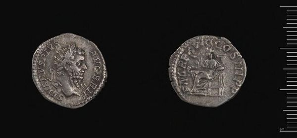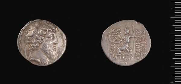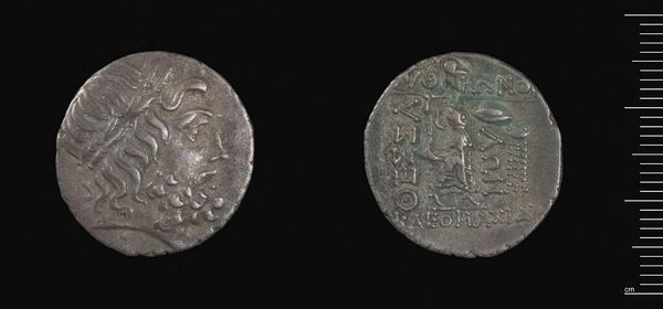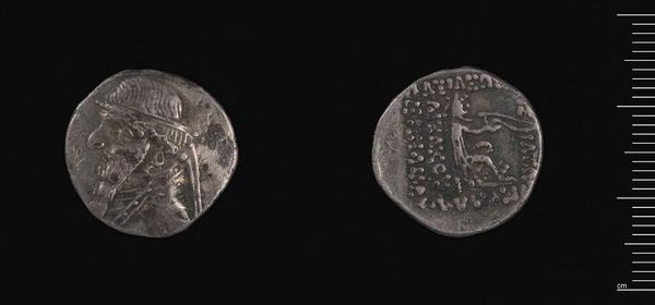 Editor: This is a silver Drachm created by Mithradates II of Parthia. What strikes me is how much detail they managed to fit on such a small surface. What do you see in this piece? Curator: I observe a compelling contrast between the strong, almost rigid, profile of the ruler and the more fluid depiction on the reverse. Note how the engraver uses line weight to create depth. Editor: The figure on the reverse appears seated, almost relaxed. Curator: Indeed, the composition utilizes a seated figure to convey power and authority. The linear construction also suggests a specific stylistic choice, doesn't it? Editor: It does. It highlights how much detail can be expressed through simple lines. Thanks! Curator: My pleasure. The starkness emphasizes the form's inherent qualities.