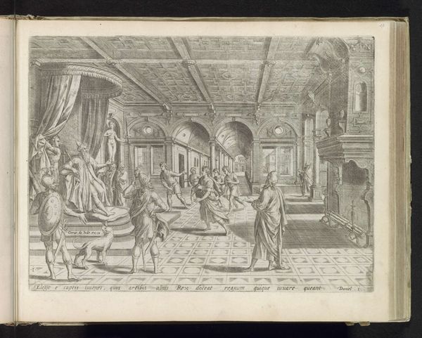 Curator: Immediately, I'm struck by how theatrical this feels, almost stage-like in its arrangement. The artist is Lucas or Johannes van Doetechum, and the work, rendered in engraving, pen, and pencil, is titled *Dream of Nebuchadnezzar.* It dates back to 1585. Editor: A dream, definitely. And rendered as a dream. What an incredibly ornate room filled with a dream within a dream! It feels almost architectural with the perfect vanishing point drawing the eye to the back wall. Curator: Yes, a dreamscape articulated through Renaissance sensibilities. The tale comes from the Book of Daniel, where King Nebuchadnezzar is troubled by a recurring dream, a prophetic vision he seeks to interpret. This scene visualizes that moment. I notice the artist layers figures onto the walls inside statue niches with bodies appearing as clouds in the sky, both perhaps as representations of angels and the idea of a spiritual transformation. Editor: Precisely. The very rigid figures provide a grounding to the chaotic image. The architectural elements, so precisely rendered, act as anchors. This engraving has a remarkable balance despite its narrative complexity. The scale is interesting as well. It is easy to image this rendering in a huge painting! The texture is also pretty compelling given the constraints of the media of pen and engraving. The dog cowering beneath Nebuchadnezzar's throne also contrasts with the other statues. Is it real or Memorex? Curator: The dog serves to show how a symbol can serve different roles for different people. In our day-to-day cultural life, a dog would probably indicate fealty to authority, an attribute much wanted by many people in this society! So this can be compared to a figure set back as a statue with arms in a welcoming gesture, offering its divine love as much as its unyielding protection! Editor: An astute observation! Seeing the divine alongside such earthly images in an interior gives the dream real impact and immediacy, allowing the viewer to interpret these ideas. The way they juxtapose gives a good lesson to designers today, to bring our human world with an aura of timeless and spiritual meaning! Curator: Absolutely, an enduring testament to the power of dreams and their symbolic weight across cultures. Editor: Indeed. Thank you for providing that fascinating dive into the world that brings the ancient with a Renaissance re-birth, a rich mixture indeed.