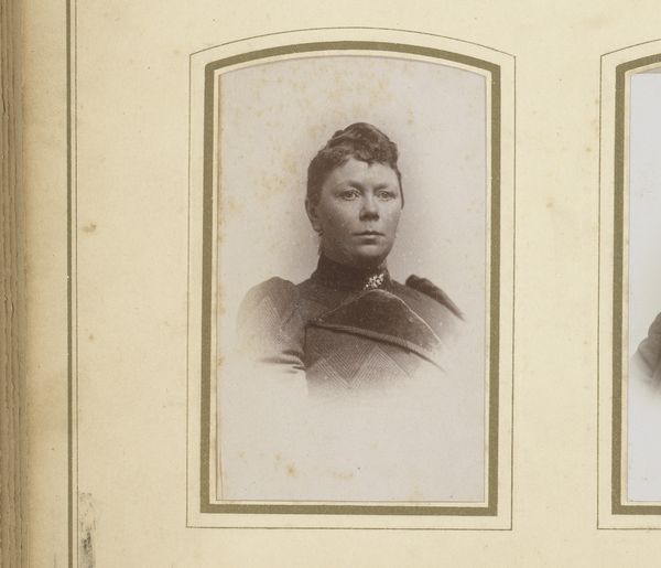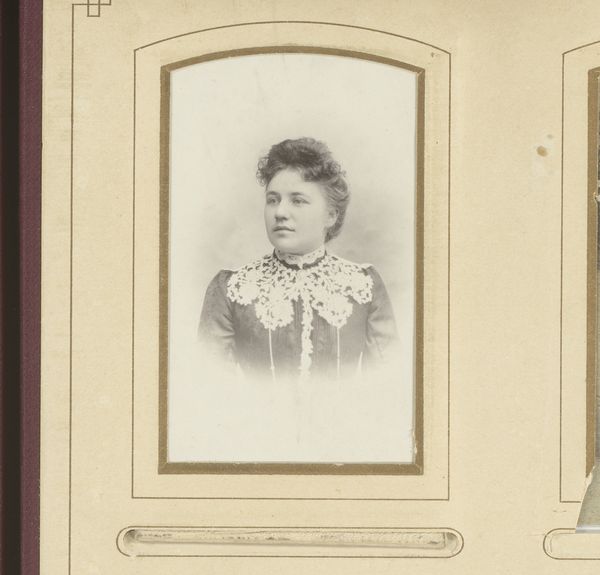 Editor: This is a photograph titled "Portret van een vrouw," dating sometime between 1881 and 1908, by Nicolaas Schuitvlot. It looks like a gelatin-silver print. The composition strikes me as quite formal, typical of portraiture from that era. What are your thoughts when you look at it? Curator: Note the precise framing. The subject's head is centered, but subtly offset, creating a dynamic tension. Her gaze meets ours directly, establishing an immediate connection. Examine the tonal range. The photographer masterfully manipulates light and shadow to sculpt her face, emphasizing her cheekbones and the set of her mouth. This is achieved through the careful process of gelatin-silver printing. Editor: The details in her clothing are amazing, especially the lace and brooch. Is there a meaning there? Curator: Consider the textures. The intricate lacework of her collar juxtaposes with the smoothness of her skin. This visual contrast invites us to consider the interplay between surface and depth, concealment and revelation. Are these embellishments simply decorative or do they point towards signifiers of social standing and class? Editor: So, by looking closely at things like texture and framing, we can really unpack what the artist was trying to communicate. Curator: Precisely. It is through this type of formal reading that we may come to appreciate the skill required for image creation. This reading can also tell us about the world that the image inhabits through a meticulous application of semiotic codes and structural components of design and form. Editor: I see the value of observing these details and their relationship within the image! Thanks.