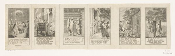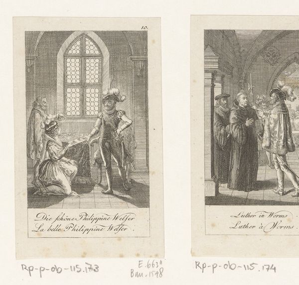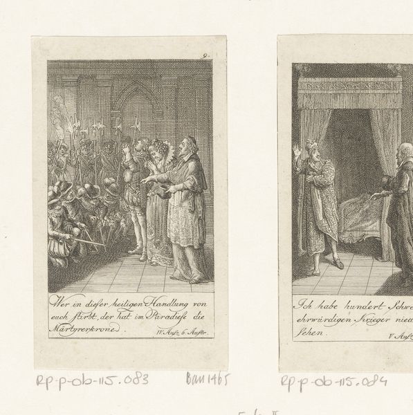 Curator: This is a fascinating print from 1796 titled "Voorstelling uit de geschiedenis van Hendrik VIII," meaning "Scenes from the History of Henry VIII," crafted by Christian Gottlieb Geyser, held here at the Rijksmuseum. Editor: My initial reaction is somber. The monochromatic tones evoke a sense of severity, and the composition feels quite stark despite all the detail. What can you tell me about how it might communicate meanings? Curator: This piece is an engraving divided into two distinct scenes. On the left, we witness the coronation of Anne Boleyn, steeped in symbolism. The elaborate robes of the clergy and Anne herself signify power and divine approval, reflecting a society obsessed with status. The other panel shows Thomas More kneeling before his execution, his posture and position creating the emotional tenor, echoing religious imagery of sacrifice and martyrdom. Editor: The materiality is interesting. The choice of engraving, a printmaking technique involving meticulously carving lines into a metal plate, suggests a desire for mass production, a wider dissemination of these images and ideas. This isn't about a unique, precious object, but rather a standardized visual narrative. Were such works usually hand-colored back then? Curator: While some were, most historical engravings such as this relied on the line work itself to communicate detail and drama. What’s potent here is the visual storytelling. The artist, though German, is participating in a much older project: portraying English history as high drama where marriage, royalty and political betrayal played out on an immense and memorable scale. Even the staging—in an identifiable church for the coronation, against simple architecture for More’s execution—contributes to historical memory. Editor: Exactly! And looking closely, I wonder what kind of labor was involved in Geyser's creative practice here. It looks almost mechanical in its detail. The uniform marks of the engraving must have required painstaking effort, pointing to an almost factory-like artistic environment, reflecting broader socio-economic shifts, even when treating older historical subjects. Curator: It serves to make an intense and layered message. Through careful composition, religious and political symbolism, and this specific mode of mechanical reproduction, we glimpse a crucial intersection between power, belief, and cultural memory. Editor: It's amazing to consider the combined effort and social conditions that enabled such prints. Seeing it today adds another layer, connecting our contemporary consumption of images with this early modern method.