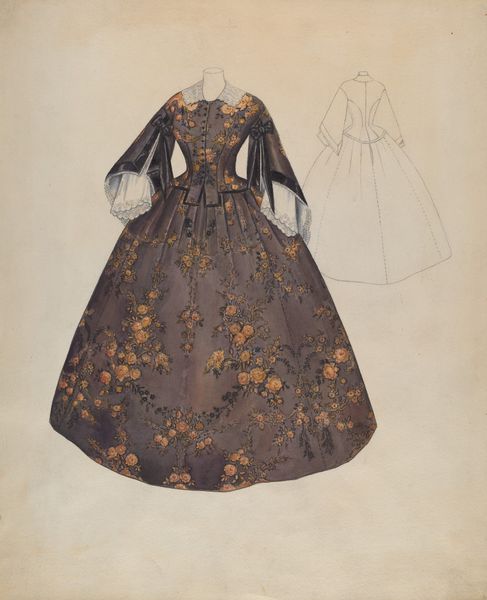 Editor: Here we have Susanna Duncombe's "Cutout Doll of a Lady in Yellow." It’s quite small, just paper really, but the dress is so voluminous! What do you see in this piece, especially given its time? Curator: I see a fascinating glimpse into the constraints and performances of femininity in the 18th century. The exaggerated width of the dress, rendered in fragile paper, speaks volumes about the societal expectations placed on women to occupy space, but only within very specific, often restrictive, parameters. How does it make you feel? Editor: A bit conflicted, actually. I see the beauty, but also that restriction you mentioned. Curator: Exactly. Duncombe offers a subtle critique, perhaps unintentional, of the performative nature of aristocratic womanhood. The doll, a symbol of innocence and play, becomes a vehicle for exploring the complex dynamics of power, gender, and representation. Editor: That’s a perspective I hadn't considered. Thanks! Curator: My pleasure! These objects hold so much more than meets the eye.