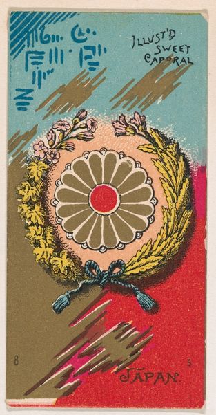 Editor: This is "Saxony, from Flags of All Nations, Series 2," a lithograph printed around 1890 by Allen & Ginter as part of a cigarette card set. The decorative art style and the influence of Japonisme give it a certain flair. What strikes me is the level of detail within such a small, mass-produced object. What stands out to you about this card? Curator: The very fact that this was distributed with cigarettes, mass-produced and traded, is central to understanding it. Forget high art; this lithograph's value lies in its role in material culture. The decorative flourish and the adoption of Japonisme speaks to the desire to elevate a mundane commodity – tobacco – through artful, appealing design. What kind of labor went into creating the plates for these cards? Who were the consumers and what did these images mean to them? It wasn't simply about enjoying the image, but about social exchange and perhaps even aspiration. How does the flag, rendered in this ornate way, change its symbolic meaning? Editor: I see what you mean. Thinking about the labor behind it… it does add another layer. How much did it cost to produce this artwork? It had to be appealing for consumers to actually engage with the cigarette product, right? Curator: Exactly. Cost of materials, labor, printing technologies, all became enmeshed into creating commercial value. The art *is* the advertising. To divorce this image from its original context is to miss the point. Do you think this level of artistic detail had an influence on the sale of cigarettes? Editor: Definitely! I never considered art from this perspective, the cigarette package as both merchandise and historical snapshot, alluding to cultural exchange, national identity, labor, and materiality. Curator: Precisely. By considering its material existence, we reveal the complex network of relationships that gave this image meaning in its own time.