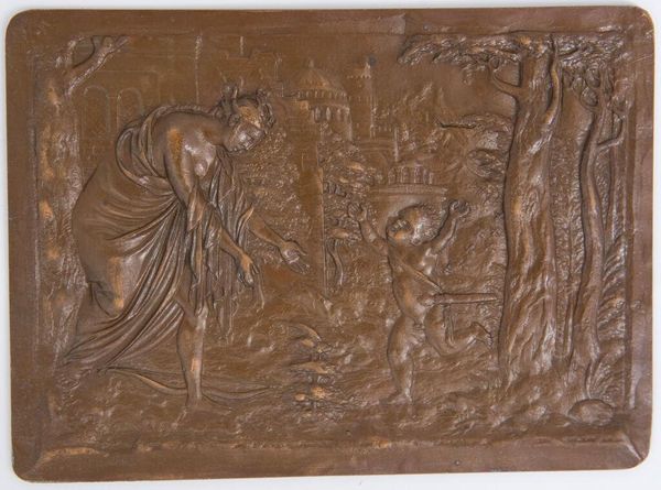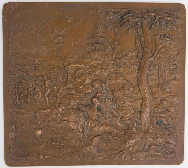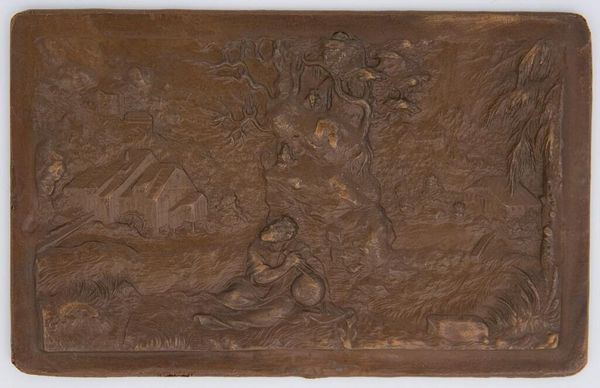 Curator: This relief sculpture, titled Prophet Jeremiah, depicts the prophet seated in contemplation. Its anonymous origins add a layer of mystery. Editor: The composition strikes me immediately. The figure is framed by the stark tree and the blurred buildings behind him. It has a somber, contemplative mood. Curator: I wonder about the choice to depict Jeremiah, a figure of immense suffering who bore witness to the destruction of Jerusalem. What does it mean to represent this prophet, especially in the absence of known authorship? Editor: I see the linear quality of the etched robes, offset by the texture of the landscape. The artist makes strategic use of depth and shadow to emphasize emotional weight. Curator: Perhaps the artist meant to invoke a sense of collective grief, given the turbulent times in which the piece was likely created. Editor: It’s a testament to how formal choices can amplify inherent themes, inviting the viewer to deeply consider its message.